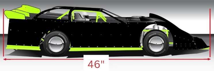 - Maximum overall body length 46″. This measurement will include the spoiler and end caps to the front bumper. See picture at the end of these rules. (Fig-1)